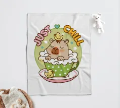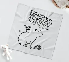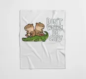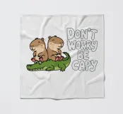 Due simpatici capibara siedono pacificamente su un coccodrillo verde, con accanto la frase scherzosa "Don't Worry Be Capy".
