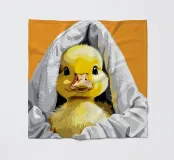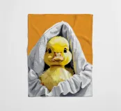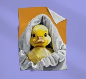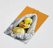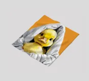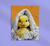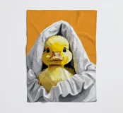 Un simpatico anatroccolo fa capolino da sotto un morbido asciugamano bianco. Le sue soffici piume gialle e i suoi occhi curiosi creano una scena adorabile e affascinante.