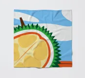 Illustrazione che mostra un frutto di durian spaccato, con un cielo blu e nuvole sullo sfondo.