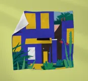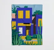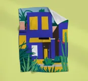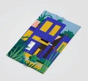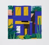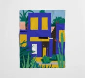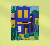 Illustrazione di un moderno edificio blu e giallo di notte, circondato da piante rigogliose. La composizione è fresca e d'atmosfera, con un'atmosfera elegante, contemporanea e urbana.