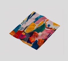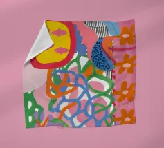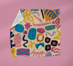 Una composizione astratta vivace e giocosa, caratterizzata da una serie di forme organiche simili a blob in blu, rosa e giallo. Le forme spontanee e i colori energici creano un senso di gioiosa espressione artistica.