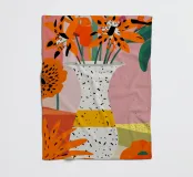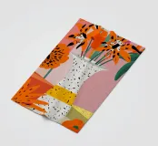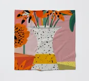 Un'esuberante natura morta di un bouquet di fiori arancioni e foglie verdi in un vaso bianco dalla fantasia unica. L'opera è piena di vita, di energia e del calore gioioso della sua tavolozza di colori.