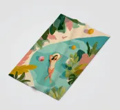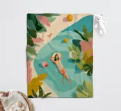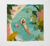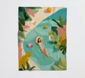 La luce del sole filtra attraverso le foglie tropicali mentre lei galleggia tranquillamente in una piscina, completamente a suo agio. Il mondo intorno a lei si dissolve in colori tenui e forme tranquille: palloni da spiaggia, sandali e il tempo stesso vengono lasciati alle spalle. Questo pezzo è un'espirazione visiva che ricorda di fermarsi, respirare e lasciare che il riposo sia sufficiente.