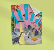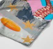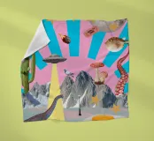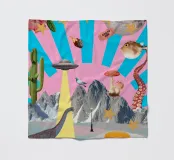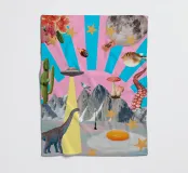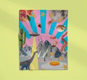 La follia colorata e il caos del collage. Ogni cosa casuale in un'immagine, con un tocco di grafica retrò. Dinosauri, alieni, polpi, funghi, pesci palla, uova fritte, montagne, lampioni, luna, biglietti del cinema, ecc.