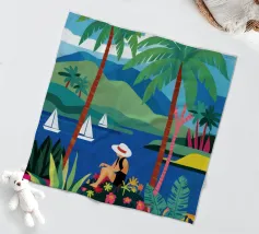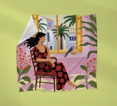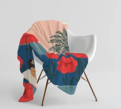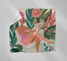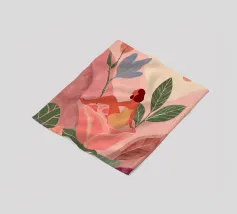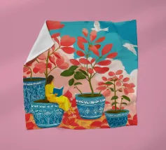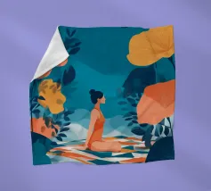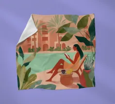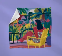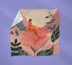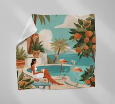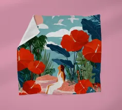 Tra imponenti papaveri corallini e palme piumate, una donna si sdraia pacificamente sotto un audace sole rosso, galleggiando su una pozza di quiete. Uccelli bianchi si librano in un cielo da sogno, facendo eco all'immobilità della sua posa. La scena, sullo sfondo di ricche montagne indaco e di un cielo color mandarino, cattura un'armonia surreale tra la natura e il sé, un momento sospeso in cui il tempo fiorisce e il pensiero si dissolve nel colore e nella calma.