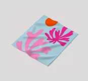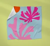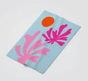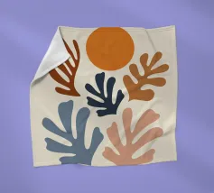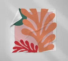 arte botanica astratta, forme moderne di piante, foglie di corallo rosa, illustrazione del sole arancione, sfondo blu pastello, design floreale minimalista, natura astratta contemporanea, grafica fogliare giocosa, opera d'arte dalle forme audaci, stampa ispirata a Matisse, atmosfera moderna tropicale, flora astratta vibrante