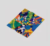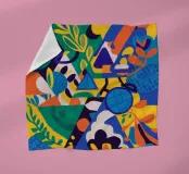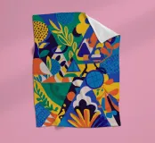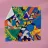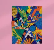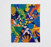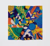 Una composizione astratta che fonde elementi floreali stilizzati con audaci forme geometriche in una vibrante tavolozza di blu, gialli, arancioni e verdi, creando una dichiarazione artistica dinamica e moderna.