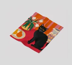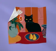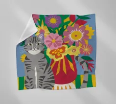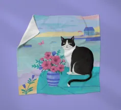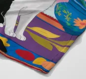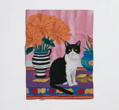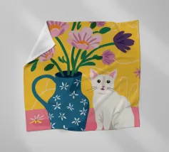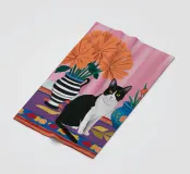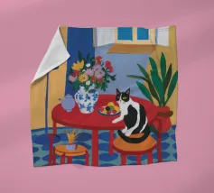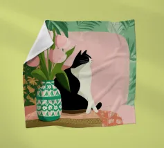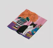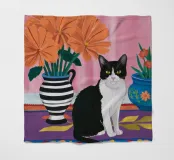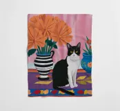 Un gatto bianco e nero siede regalmente dietro un grande vaso di fiori con motivi a strisce vivaci, sullo sfondo di una tenda rosa, creando una natura morta suggestiva e affascinante.