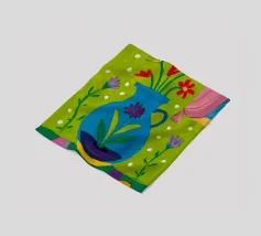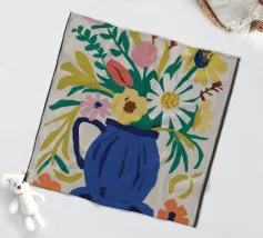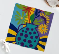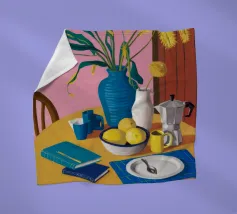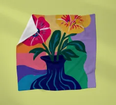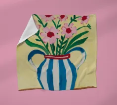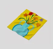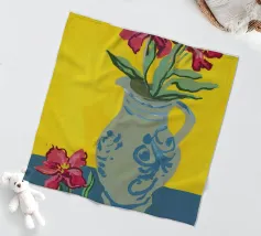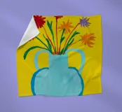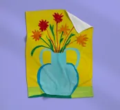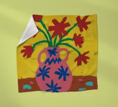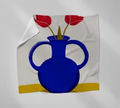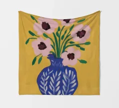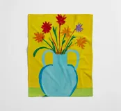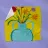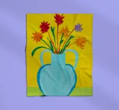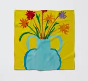 Un allegro ed espressivo bouquet di fiori gialli in un vaso blu brillante con due grandi manici. Lo sfondo giallo solare esalta la sensazione di gioia pura, semplice e senza fronzoli.