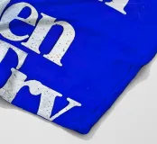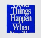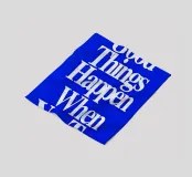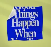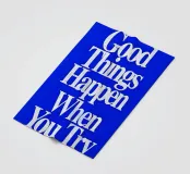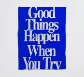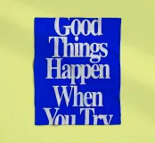 "Il messaggio edificante 'Good Things Happen When You Try' (Le cose belle accadono quando ci provi), presentato in una tipografia testurizzata di colore bianco sporco su uno sfondo blu vibrante, crea un senso di speranza e incoraggiamento. La texture leggermente rovinata aggiunge un tocco vintage e accessibile al design",