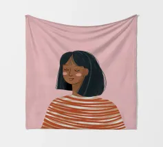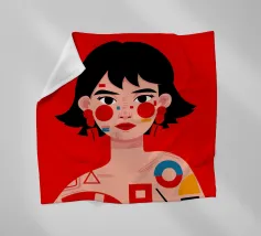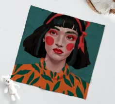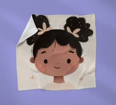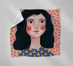 Un ritratto semplice e grafico di una ragazza con capelli corti e neri e guance rosee, che indossa un top verde, con un'espressione diretta e leggermente imbronciata su uno sfondo bianco.