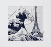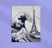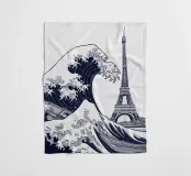 L'immagine raffigura un'illustrazione stilizzata in bianco e nero della Grande Onda al largo di Kanagawa, una famosa xilografia giapponese, con la Torre Eiffel sovrapposta all'onda. L'onda è raffigurata in un movimento dinamico e vorticoso, con creste spumeggianti e una base blu intenso. La Torre Eiffel si erge alta e slanciata, con la sua struttura intricata che contrasta con la forma organica dell'onda.