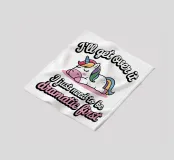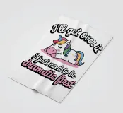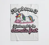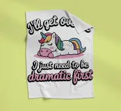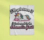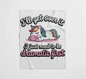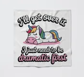 Un simpatico unicorno è sdraiato con una criniera colorata e appare rilassato e soddisfatto. Sopra e sotto l'unicorno, il testo recita umoristicamente: "Mi passerà, devo solo essere drammatico prima".