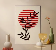Quest'opera d'arte è caratterizzata da un audace sole rosso e da un ramo botanico scuro e fluente, che fonde forme geometriche e linee organiche. Il design si ispira all'estetica giapponese, fondendo il minimalismo giapponese e l'armonia scandinava. Il contrasto tra il nero profondo e il rosso vibrante e la crema morbida crea una composizione suggestiva e tranquilla. Perfetto per chi apprezza la natura, l'equilibrio e l'arte astratta senza tempo, questo pezzo dona un senso di calma ed eleganza a qualsiasi ambiente.