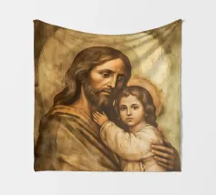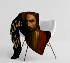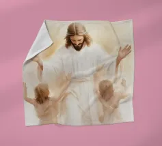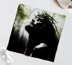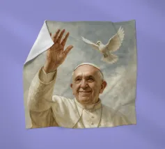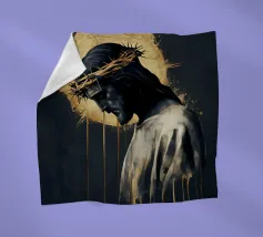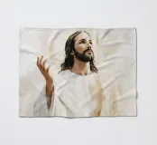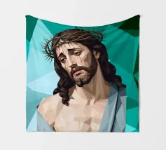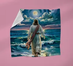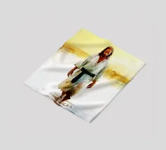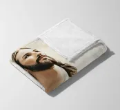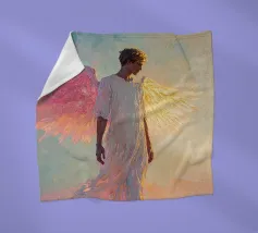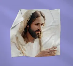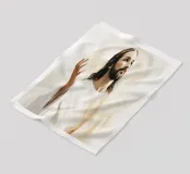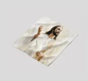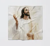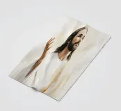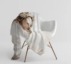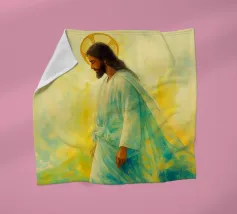 Una serena rappresentazione di una persona con capelli lunghi e barba, vestita con una fluente veste bianca, guarda verso l'alto con un'espressione pacifica. Sfondi morbidi e simili a nuvole esaltano l'atmosfera eterea e spirituale.