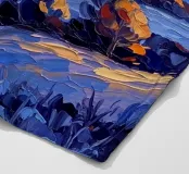 Questo splendido dipinto a olio originale, realizzato con una spatola, cattura la transizione mozzafiato di un paesaggio autunnale. La tecnica a impasto spesso crea una texture ricca e tridimensionale che rende l'opera viva. I tratti audaci di blu e viola vibranti delle colline e del cielo sono splendidamente contrastati dai caldi arancioni e gialli degli alberi autunnali. Questo pezzo è una celebrazione della luce e della struttura, perfetto per aggiungere un tocco di serena e dinamica bellezza a qualsiasi casa o ufficio. È un vero e proprio oggetto da collezione per coloro che apprezzano le qualità espressive e tattili di questa opera.
