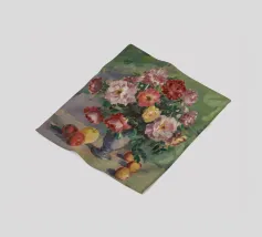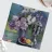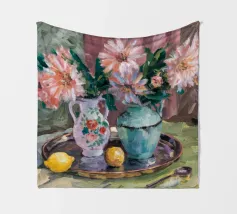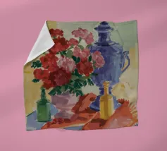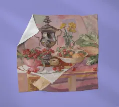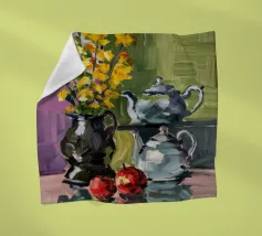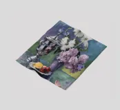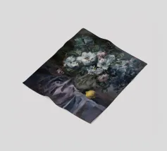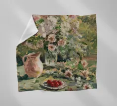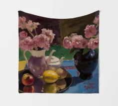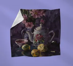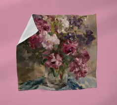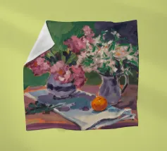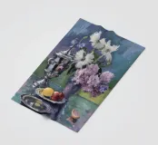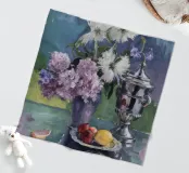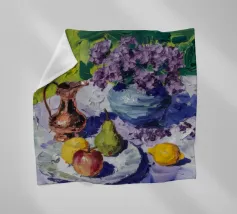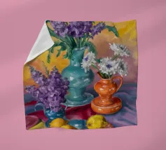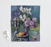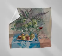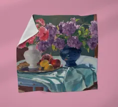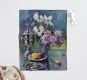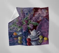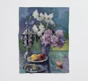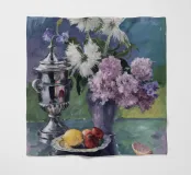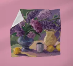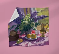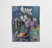 Una natura morta con una brocca d'argento riempita con un rigoglioso bouquet di lillà viola e rosa. Un bicchiere di vino rosso e della frutta si trovano su una superficie scura e lucida che riflette gli oggetti.
