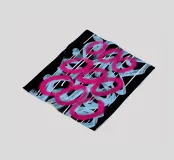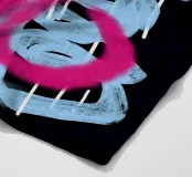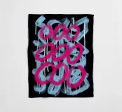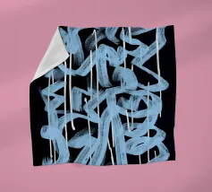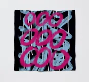 Vivaci pennellate rosa formano forme ad anello su uno sfondo di vernice blu pallido su un fondale nero. Gocce di vernice bianca scendono dagli accumuli di colore più spessi, dando un senso di movimento alla composizione.