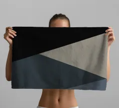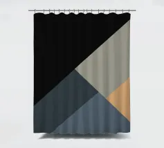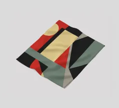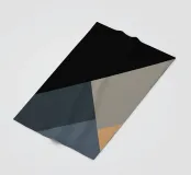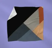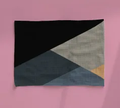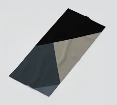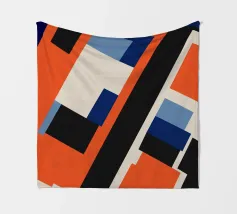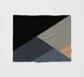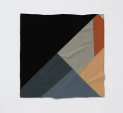 Forme geometriche astratte formano una composizione con audaci linee diagonali che si intersecano in vari angoli. La tavolozza è composta da toni tenui, tra cui nero, grigio, beige e ruggine.