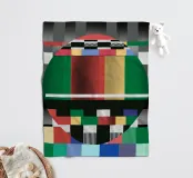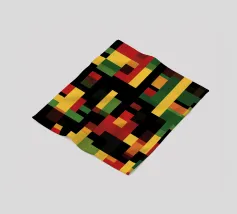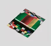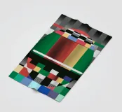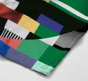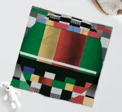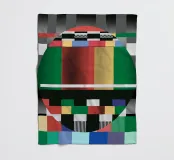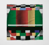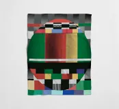 Una composizione di motivi geometrici presenta un cerchio con audaci strisce verticali rosse, gialle e verdi, intersecato da barre orizzontali e circondato da una varietà di rettangoli a scacchi e a tinta unita. Un mix di colori vivaci e tenui, insieme a linee nette, sono i motivi che caratterizzano la composizione.