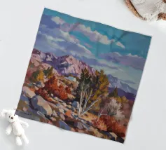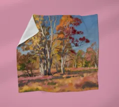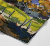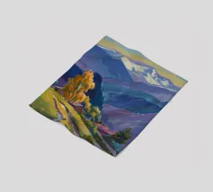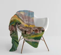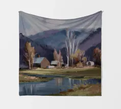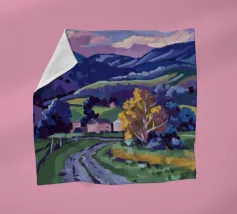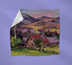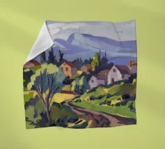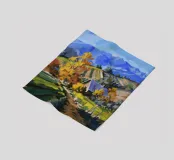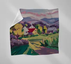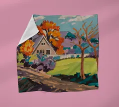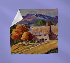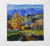 Un pittoresco paesaggio autunnale che raffigura un villaggio o una fattoria adagiata su una collina, circondata da un mosaico di alberi colorati nei toni dell'arancione e del giallo e da campi coltivati, con le lontane montagne blu a completare la scena.