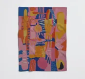 Una sofisticata composizione astratta con un patchwork di forme geometriche e organiche in una tenue tavolozza di colori pastello. Il pezzo ha un aspetto calmo ed equilibrato, con una qualità sottile e strutturata.