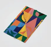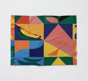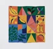 Un audace e dinamico patchwork di forme geometriche, con banane stilizzate e foglie tropicali. La palette di colori vivaci e il forte stile grafico creano una composizione giocosa ed energica.