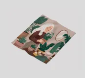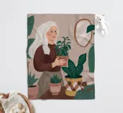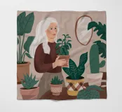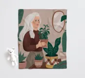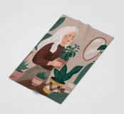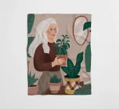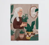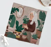 Una donna anziana cura le sue piante in una stanza dai toni tenui, esprimendo saggezza, calma e un legame senza tempo con la natura.
