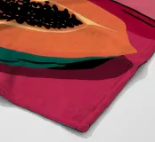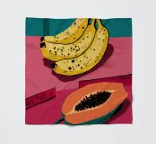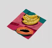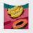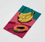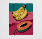 Un'illustrazione audace e ispirata alla pop art di banane e papaya su un piatto rosso brillante. I colori ad alto contrasto e lo stile grafico creano una dichiarazione vibrante e giocosa.