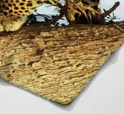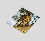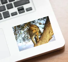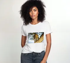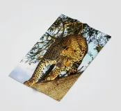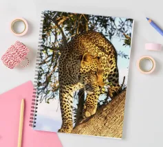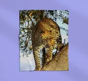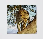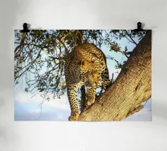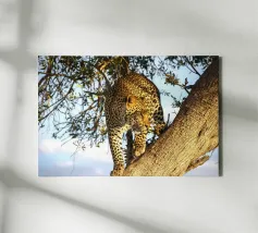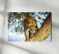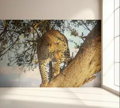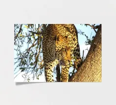 Il leopardo si muove con grazia sull'albero, i suoi forti muscoli si increspano sotto il manto dorato e maculato. Con artigli affilati e potenti, si arrampica senza sforzo, afferrando la corteccia ruvida mentre sale. I suoi occhi penetranti rimangono vigili, scrutando l'ambiente circostante in cerca di pericoli o prede.