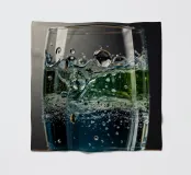 Un bicchiere riempito di liquidi colorati mostra vibranti tonalità verdi e blu. Le bolle si formano quando i liquidi si mescolano, creando un aspetto vivace e rinfrescante sotto una luce soffusa.