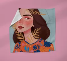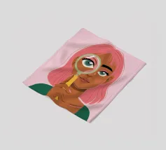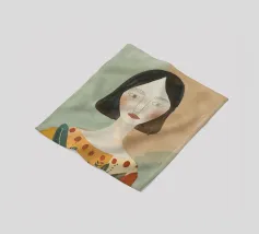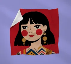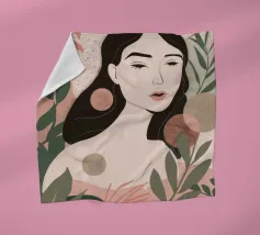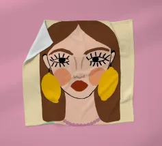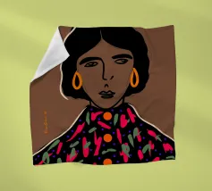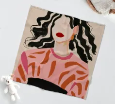 Il dipinto raffigura una persona con capelli corti e scuri acconciati a onde, che indossa un abito con motivi retrò e cerchi e diamanti nei toni del rosa, del marrone e del beige. Lo sfondo è di un semplice colore beige chiaro.