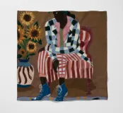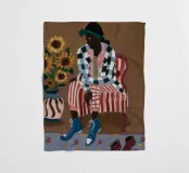 Questa opera d'arte mostra una persona seduta su una sedia a righe, circondata da girasoli e da una borsa verde. Lo sfondo è di un marrone tenue che crea un'atmosfera rustica e riflessiva.