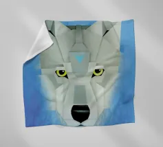 Un lupo bianco sembra emergere da una nuvola di nebbia su un suggestivo sfondo blu. La raffigurazione del lupo è morbida ed eterea, con i suoi dettagli che sfumano delicatamente nel vapore circostante.