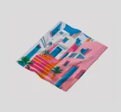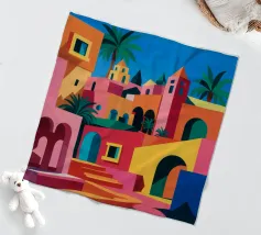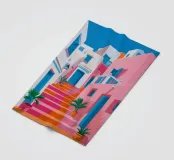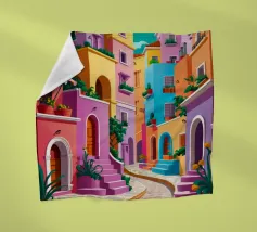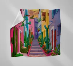 Quest'opera d'arte cattura la bellezza iconica di un'isola greca con i suoi gradini vivaci e colorati nei toni del rosa, dell'arancione e del rosso. La classica architettura bianca e blu incornicia la scena, creando un'immagine gioiosa e pittoresca che trasporta immediatamente in un vicolo soleggiato di Santorini.