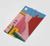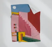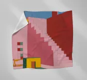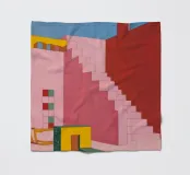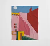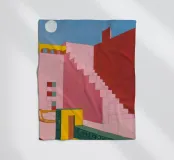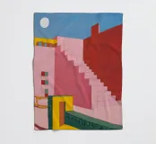 Un'opera architettonica di grande effetto, con una lunga scala rosa che sale verso un sole o una luna gialli e luminosi in un cielo blu scuro. La composizione è audace, minimalista e fortemente simbolica.
