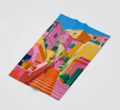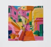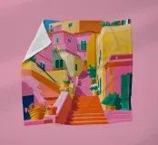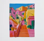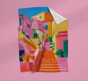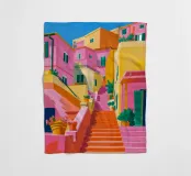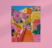 Una vivace scena di strada con edifici colorati e una scalinata rosa acceso che sale verso l'alto, evocando una vivace città costiera mediterranea o italiana.