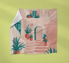 Una classica scena mediterranea che raffigura un edificio rosa con una scala che scende verso un tranquillo mare blu. Quest'opera d'arte cattura perfettamente il fascino solare e pacifico di un'isola greca.