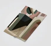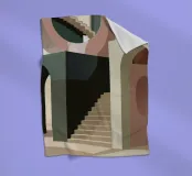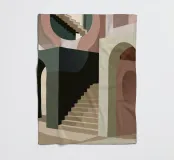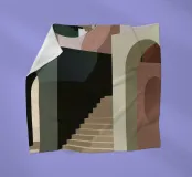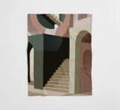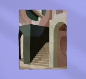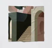 Uno spazio architettonico astratto è definito da una scalinata spoglia e da archi sovrapposti, con un drammatico gioco di luci e ombre che crea una composizione potente e minimalista.