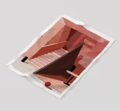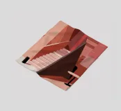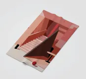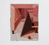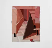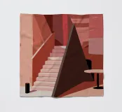 Un'imponente scalinata domina uno spazio interno reso interamente in toni di rosa, salmone e terracotta, creando una scena calda, monocromatica e lunatica.