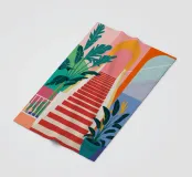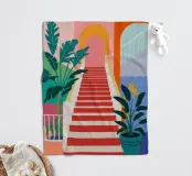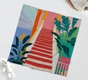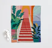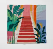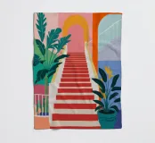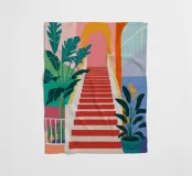 Scale rosse e vivaci conducono attraverso un edificio colorato e semplificato verso un lussureggiante ingresso ad arco, suggerendo un viaggio verso una destinazione bella ed esotica.