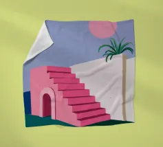Scale rosse e vivaci conducono verso l'alto passando davanti a una finestra che rivela un cielo soleggiato, una palma e un sole splendente, a simboleggiare un viaggio verso una destinazione gioiosa.