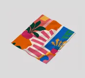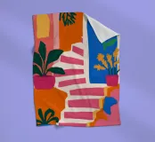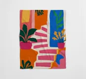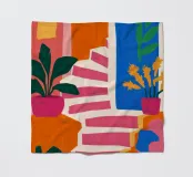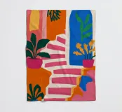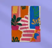 Un'illustrazione astratta mostra una scala colorata adornata da una varietà di piante in vaso, fondendo architettura e botanica in una composizione vivace e moderna.