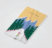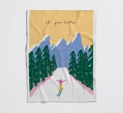 "Ski you later" - un gioco di parole tipografico incontra una colorata illustrazione invernale. Uno sciatore scivola rilassato lungo una pista bianca, circondato da abeti scuri e montagne viola. Il cielo si illumina di un caldo giallo pastello e conferisce alla scena un accenno di tramonto. Questo poster combina gli sport invernali con l'umorismo e una varietà di colori: un allegro richiamo per tutti gli amanti dello sci e della montagna.