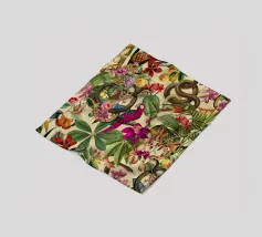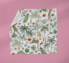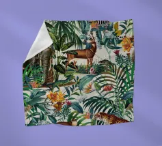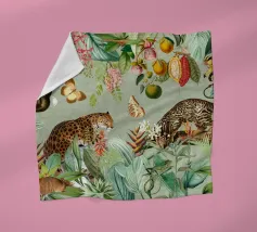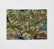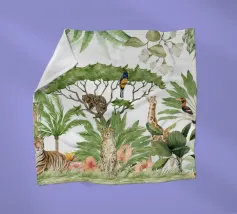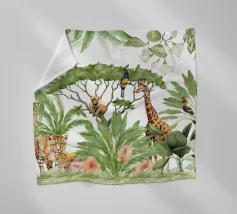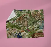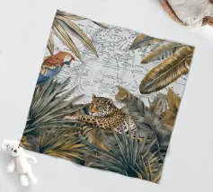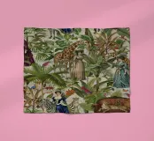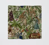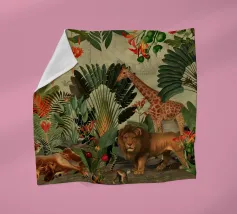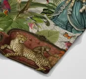 Questo incantevole disegno unisce l'eleganza vittoriana alla fantasia tropicale in una scena meravigliosamente stravagante. Graziose signore in ornati abiti d'epoca si aggirano in paesaggi lussureggianti pieni di palme e fiori esotici, interagendo giocosamente con mansueti animali selvatici. Alcune cavalcano zebre con composta dignità, altre si rilassano su divani barocchi accanto a sereni ghepardi, mentre alcune offrono dolcetti a gentili giraffe. La composizione è ricca di dettagli e deliziosamente surreale, creando un mondo vivace e pieno di affascinanti sorprese che si rivelano più a lungo si guarda.