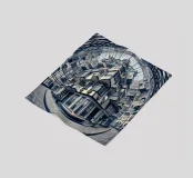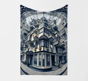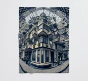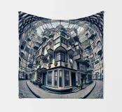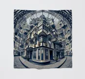 Una splendida vista fisheye di un atrio futuristico caratterizzato da un'architettura geometrica, balconi e un soffitto a cupola di vetro. L'intricato gioco di forme e luci crea un design urbano coinvolgente e di grande impatto visivo.
