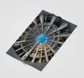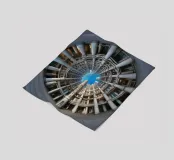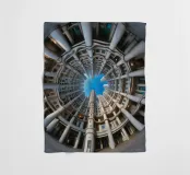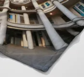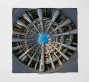 Un suggestivo disegno architettonico circolare caratterizzato da file concentriche di alte colonne ed edifici interconnessi. La prospettiva fisheye enfatizza la simmetria geometrica e si apre su un cielo azzurro e limpido, creando una scena urbana suggestiva e coinvolgente.
