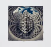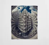 Una prospettiva fisheye surreale che mostra una torreggiante architettura gotica futuristica con dettagli intricati e motivi simmetrici, sullo sfondo di un cielo blu vibrante con nuvole drammatiche. L'immagine evoca la modernità mescolata a elementi di design classico.
