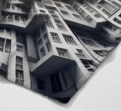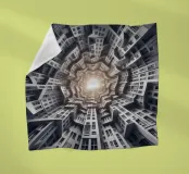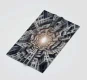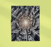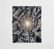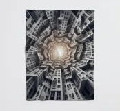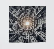 Una disposizione futuristica a spirale di edifici che convergono verso una fonte di luce radiante, creando un modello geometrico ipnotico e una profondità dinamica. I toni monocromatici esaltano l'estetica moderna e surreale.