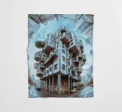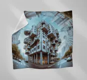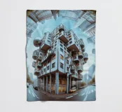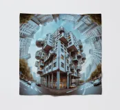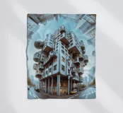 Un sorprendente edificio modulare con elementi futuristici, tubi e strutture sferiche, circondato da un paesaggio urbano distorto. La composizione fantasiosa fonde l'architettura moderna con il surrealismo, creando una prospettiva unica e dinamica.